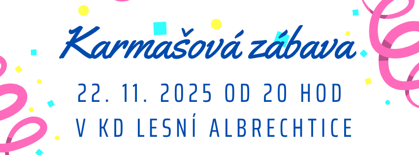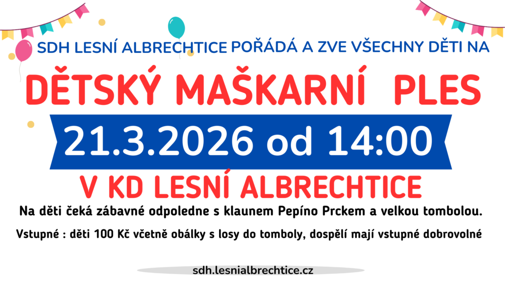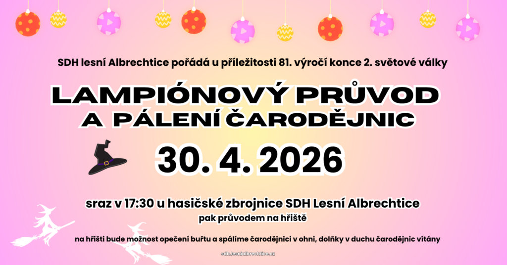 SDH lesní Albrechtice pořádá u příležitosti 81. výročí Dne vítězství Lampiónový průvod a pálení čarodějnic 30. 4. 2026 od 17:30 hod. Sraz k průvodu bude v 17:30 hod.u hasičské zbrojnice. Na hřišti bude možnost opečení buřtu a spálíme čarodějnici v ohni, dolňky v duchu čarodějnic vítány.